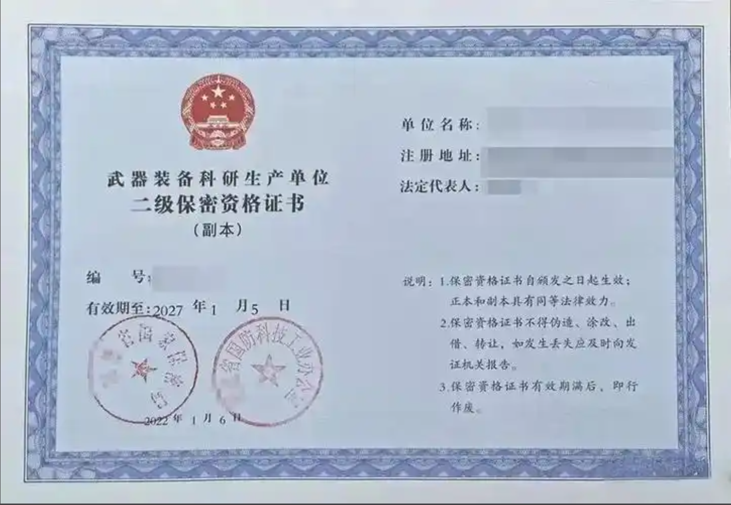 军工保密资质分为一级、二级两个等级。军工一级保密资质单位可以承担绝密级、机密级、秘密级武器装备科研生产任务;军工二级保密资质单位可以承担机密级、秘密级武器装备科研生产任务。