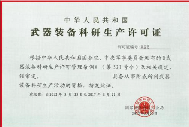 五、证书内容1.法人名称;2.法定代表人;3.注册地址;4.科研生产场所地址;5.许可的专业或者产品名称;6.证书编号;7.发证机关;8.发证(换证)日期;9.证书有效期限。装备科研生产许可分为一类许可和二类许可,许可性质分为科研和生产,许可证书有效期为五年。