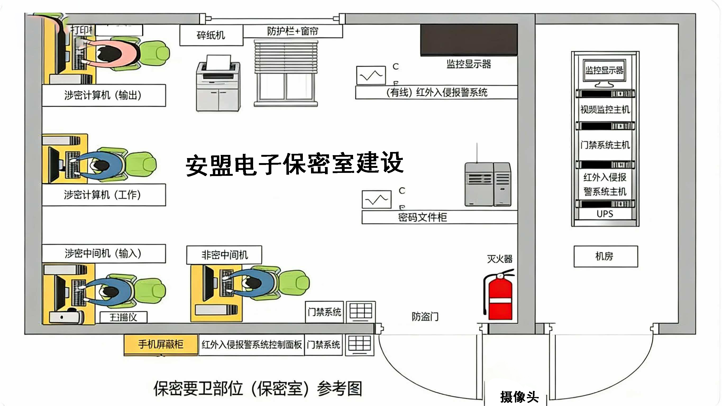 资质办理,保密室建设,保密安全软件 :安盟电子雷老师 13772115538 保密室建设规范新要求 保密要害部门,是指机关、单位日常工作中制作、存储、保管涉密载体的专用、独立、固定场所,如机关、单位的保密室、档案室、涉密信息系统机房、涉密实验室等。根据保密资格的等级分为:一级保密室、二级保密室。 一、保密室的构成要素 硬件:主要是物理防护措施,实墙、铁门、铁窗、监控、红外报警器、门禁等。 软件:主要是安全软件防护措施,如安装三合一、主机监控与审计系统,身份鉴别系统,打印刻录审计系统,恶意代码辅助检测系统、病毒查杀系统,保密检查工具,存储介质消除系统等; 保密设备:涉密计算机、涉密打印机、保密碎纸机,移动信号干扰器,红黑电源、视频干扰器、保密文件柜等、手机屏蔽柜。 管理制度:主要是通过管理规定进行防护,如保密制度、涉密人员管理制度、涉密载体管理制度等。 人员:主要是对保密室具体操作人员的操作防护、保密领导干部、保密三员需接受国家培训,持证上岗,以确保安全操作。 二、保密室的建设规范 1、选址要求 ①应选择远离境外驻华机构、境外人员驻地等涉外场所、场地或部位。 ②应选择远离商业、娱乐、旅游、餐饮和宾馆等人员复杂的公共场所、场地或部位。 ③应位于单位内部,远离对外业务服务区、公用区域和本单位边界。 ④所在单位若与其他单位共用一栋建筑,应设置门禁或人员管控等出入口控制措施。 ⑤应设在二楼以上,但不宜设在顶层。 2、建设要求 门的要求:应采用符合 GB 17565 要求的甲级防盗安全门,并配备自动关门装置。 窗的要求: ①窗应加装金属防盗栏。防盗栏应符合以下要求: a) 防盗栏应使用直径不小于 16mm 的实心钢条;若选用不锈钢管,则应在钢管内穿有直径不小于16mm 的实心钢条; b) 防盗栏杆的竖向平行间距不应大于 100mm; c) 防盗栏应使用不小于 Φ 12mm 的膨胀螺栓固定,安装应牢固可靠。 ②窗若采用其他防非授权闯入设施,则应符合相关要求。 ③窗口应采取加装窗帘或贴膜等遮挡措施,以防窃照。 墙体要求:保密室应是独立房间,以钢筋混凝土框架结构为宜,且保密室外墙应为到顶的实体墙,墙体厚度不应小于 180mm。若保密室外墙无法满足到顶实体墙要求,则应按 加装金属防盗栏的要求安装到顶的防盗栏并采取遮挡措施,安装应牢固可靠。 通风管道要求:若存在通风口、管道口或其他孔洞,应设置牢固可靠的防范措施,以防止人员爬入。 供电系统要求:保密室应采取措施保证视频监控系统和入侵报警系统 7×24h 不间断供电。 三、保密室的安全防护要求 1、安全防护系统的要求 保密室的视频监控系统和入侵报警系统应独立设置、独立运行并能对其运行状态进行监测和控制,并提供可靠的监测数据和管理需要的报警信息。 电子门禁系统: 保密室主要出入口应安装双向门禁系统,实时记录人员进出时间。涉密文件存放区、电梯口等要害部位也应配置出入控制装置,实现通行对象、时间、方向的精细化管理 视频监控系统: ①保密室应安装分辨率不低于 1080p,符合 GA/T 367 中一级要求具有红外夜视监控功能的视频监控系统。 ②视频监控应安装在合适位置,可对门口、窗边及内通道进行无死角监控,显示人员进出保密室的过程,应避免泄露密码文件柜、防盗安全门密码以及文件、计算机显示的内容。保证 24 小时不间断对保密室门口、窗边及内通道进行实时监控。 ③视频图像记录内容应包括日期、时间、图像内容等信息。监控图像的浏览与回放应设有权限限制,监控记录保留时间应不少于 3 个月 建议6个月。 入侵报警系统: ① 保密室应安装符合 GB 50394 相关规定的入侵报警系统,安装高度、位置、覆盖范围应适当,全面覆盖可能发生非法入侵的门、窗、通风管道等重要位置。 ②有非法入侵时,现场应自动启动报警装置,报警声应不小于 80dB(A),并及时通知相关人员至少 2 人。报警应持续到相关人员确认警情后自动或手动解除。 ③应确保入侵报警系统处于正常工作状态,每季度至少检查一次。保密室在非工作时间或无人值守状态下应开启报警系统进入布防状态,其布防、撤防、报警等信息存储时间应不少于 6 个月。 2、保密设备要求 ①保密室应配置足够的保密文件柜,确保所有国家秘密载体按要求放 入保密文件柜中保管。 ②保密室应配备符合国家保密要求的国产碎纸机等涉密载体销毁设备。 ③保密室内应设有手机信号屏蔽设备或保密室门口装有手机信号屏蔽柜。 ④保密室内如涉及打印复印工作,应配备国产保密认证的打印、复印外设产品。 ⑤保密室内涉密电脑应用符合保密要求的国产电脑。 ⑥涉密办公电脑需配备专用的微机视频保护系统,电脑外设应配用涉密专用的红黑滤波隔离插座。 ⑦涉密电脑应安装符合保密要求的专用保密软件,如涉密计算机存储介质管理系统,打印刻录监控审计系统,主机安全登陆审计系统,涉密计算机保密检查系统等。 ⑧制定严格的保密管理制度,严格按保密制度开展工作。 3、防火要求 保密室不应设置明火设施和存放易燃易爆物品,并按要求配备火灾报警和消防灭火设施,室内装修应符合 GB 50222 的相关规定。 4、防水要求 保密室内不应设置消防以外的给水系统,给排水管不应安装在保密室内。
